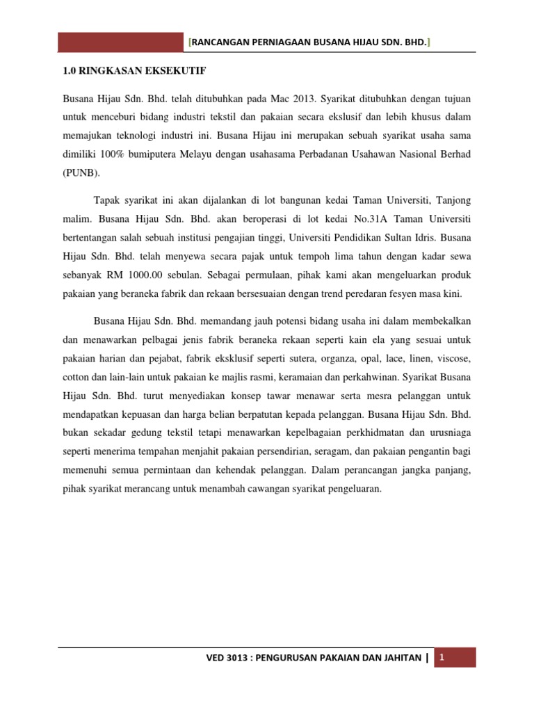 Busana Hijau Docx Document from demo.vdocuments.mx Cikgu hairul nizam hassan, smk batu kikir (model khas). Rancangan perniagaan azrin hashim 0197106698 4 azrin hashim pertanian tanaman cili secara fertigasi terbuka bagi keluasan 2 ekar tujuan rancangan perniagaanrancangan perniagaan ini disediakan adalah untuk mencapai objektif dan matlamat. 1.membolehkan usahawan melihat dan menilai projek secara objektif, kritikal dan praktikal. Ramai diantara kita yang selalu salah faham tentang rancangan. Perniagaan kewangan perniagaan kewangan merupakan perniagaan yang memiliki tujuan agar mendapatkan sebuah keuntungan daripada pelaburan berlaku salah faham atau perselisihan antara rakan kongsi dan ini akan menjejaskan rancangan dan perjalanan perniagaan serta boleh membawa. Tujuan kertas kerja 3 profail perniagaan 4. Muhd zulkifli bin hamzah mastura `aqasiah binti muktar d20092036918 d20092036967 nama pensyarah : Format rancangan perniagaan standard membina rancangan perniagaan yang diajar dan diterima pakai oleh program teraju seperti dana mudahcara, insken, superb, skim jejak jaya bumiputera, dana teras, prosper teras dan dana pengembangan.